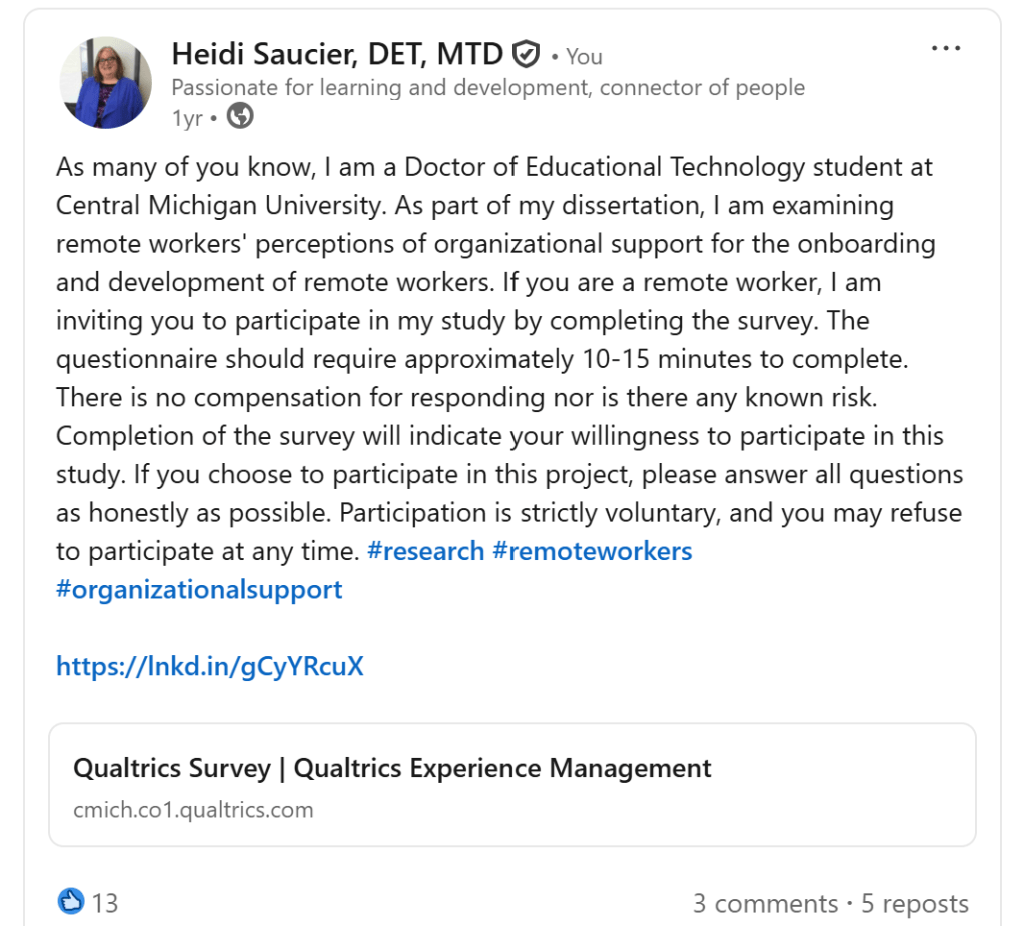 The time finally came for me to start my dissertation. One of the first things I had to do was get approval to do my research. Because my study included human subjects, this involved submitting a request to the university’s Institutional Review Board, or IRB.  The request included the goals of my study, a description of the sample, and how I would gather data. The group reviews requests and determines if the study is ethical and follows the university’s policies. My original plan was to ask volunteers to complete an online survey for my quantitative paper, then ask for leaders of remote or hybrid teams to participate in interviews about their experiences for my qualitative paper. I received feedback from the IRB looking for clarification and additional things I would need to do for the interviews, which posed some unexpected challenges. Due to some deadlines I needed to meet, I discussed alternative options with my adviser. We agreed that I could still do a qualitative study using open-ended questions in the survey I was creating for my quantitative research. I adjusted my IRB submission and resubmitted it to the board. Shortly after that submission, I received an approval. I could now move forward with sending out my survey and collecting data.